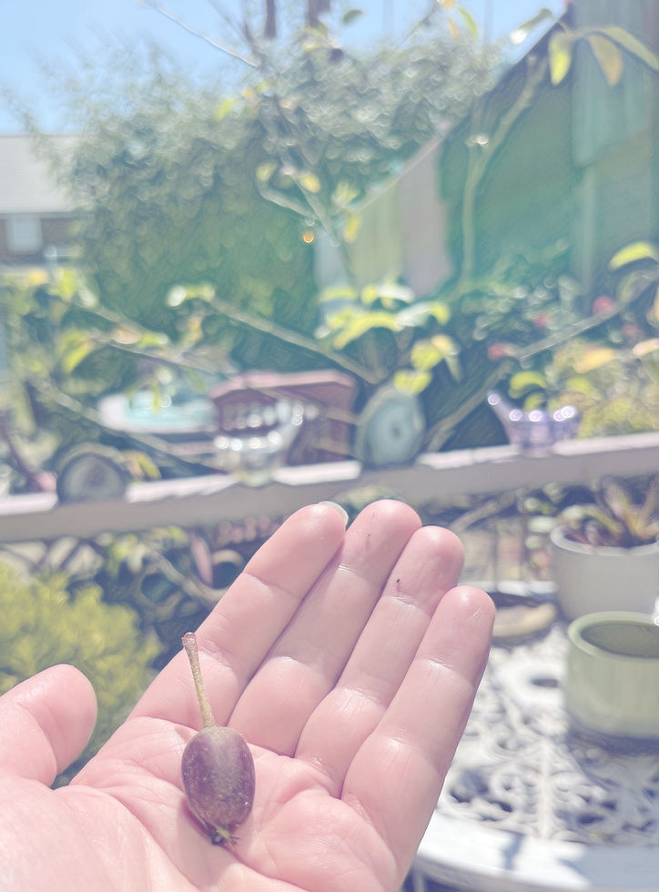 This morning I was able to sit on the decking for the first time in a long time and I noticed that one of her fruits ( yes I’m sure she is a she) had fallen.